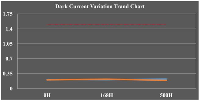 大尺寸MPD芯片经过了“高温老化”和“高温高湿双85”的可靠性验证。高温可靠性的检测时间,超过1500小时,暗电流变化幅度控制在5%以内,时长远超业内常规的[24,72]小时。“双85”老化实验条件下,封测超过500小时,暗电流稳定维持在标准以下。